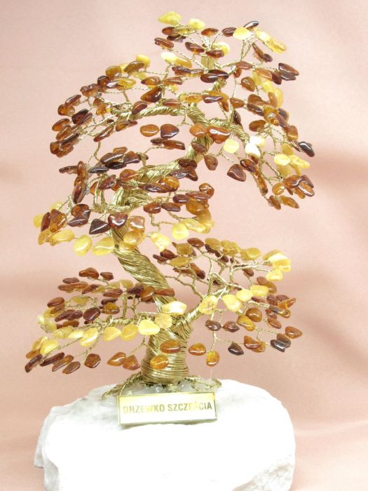 Piękne drzewko szczęścia "Bonsai" z kamieni naturalnych - bursztynu koloru mieszanego - mlecznego i koniakowego - na pniu z drutu mosiężnego i podstawie z marmuru.Na drzewku zamontowane od 272 do 408 kamieni. (Nr prod.: 1821/A-4bursztyn mix)