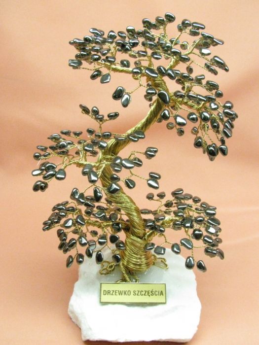 Piękne drzewko szczęścia "Bonsai" z kamieni naturalnych - hematytu - na pniu z drutu mosiężnego i podstawie z marmuru.Na drzewku zamontowane od 272 do 408 kamieni. (Nr prod.: 1823/A-4 hematyt)